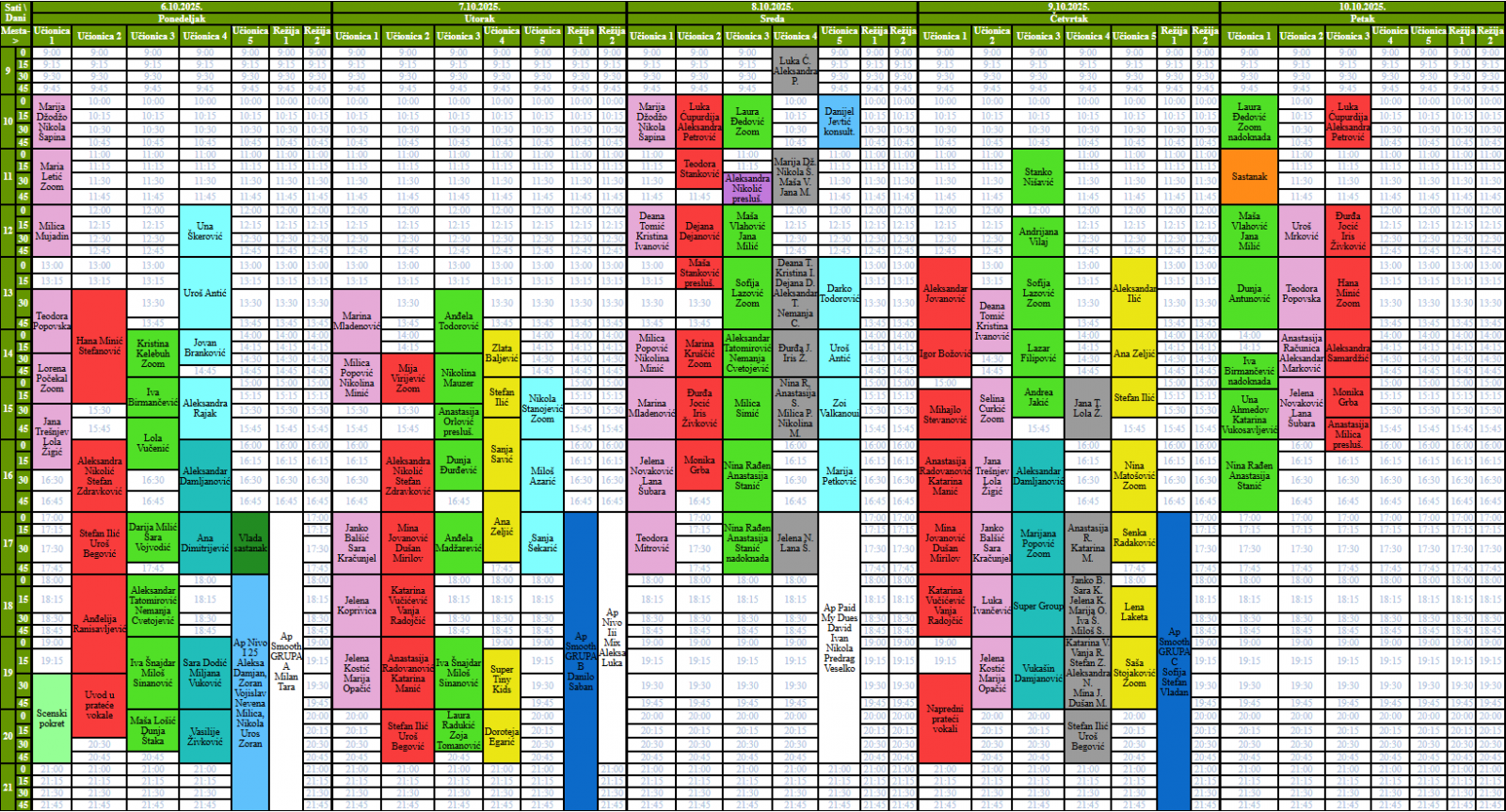 Raspored časova škole pevanja i škole audio produkcije.